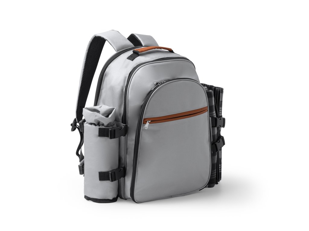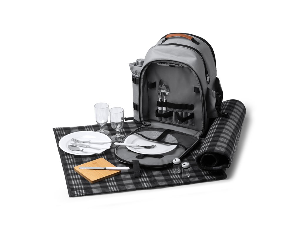 Piknikový batoh z RPET polyesteru. Hlavní přihrádka obsahuje: 2 hrnky, 2 talíře, 2 sady příborů. Jedna boční přihrádka na piknikovou deku (je součástí balení) a jedna boční přihrádka na láhev.