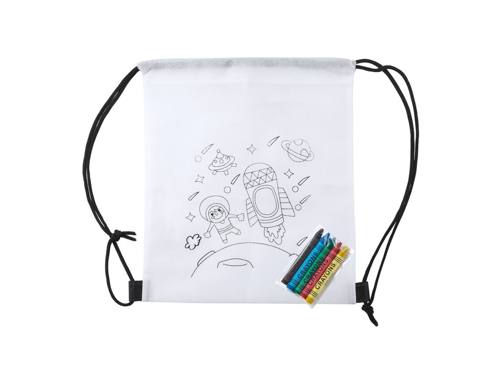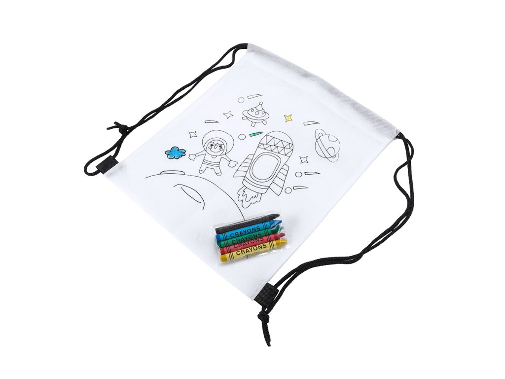 Netkaný stahovací batůžek s designem na vybarvování. Součástí balení je 5 pastelek v různých barvách.