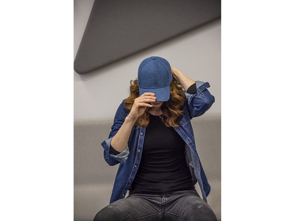 Šestipanelová čepice v džínovém vzhledu, vyztužené čelo, obšité větrací otvory a zapínání na suchý zip.