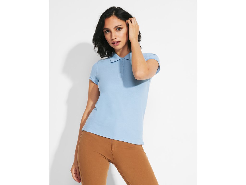 Dámská přiléhavá polokošile se zapínáním na tři knoflíčky. Límec a olemování rukávů v žebrovaném úpletu, zpevněné skryté švy na průkrčníku, boční rozparky.