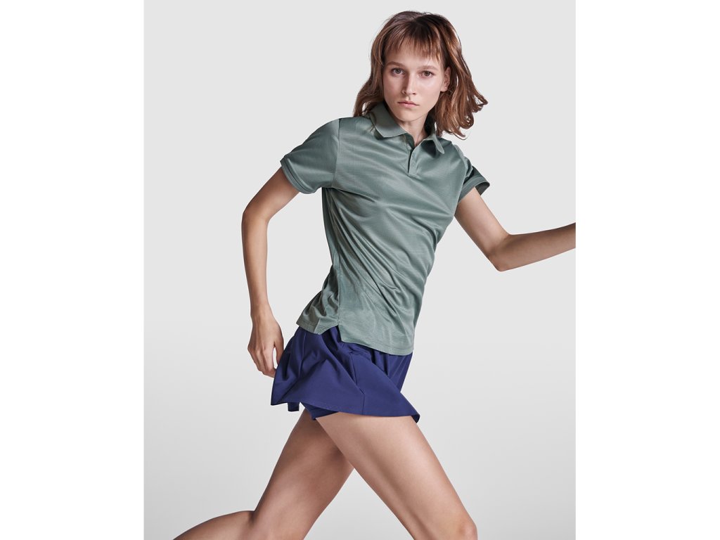 Dámská technická polokošile s krátkým rukávem s přiléhavým střihem. Límec z polyesteru s 1x1 žebrováním a plastovými sponami, které ladí s klopami. Odpovídající kryty švů. Rukávy s odpovídajícím 1x1 žebrováním.