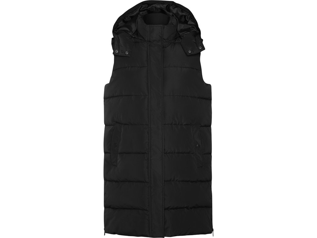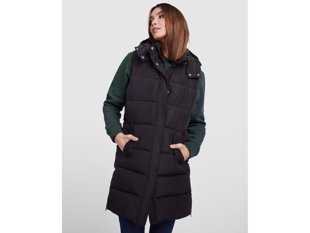 Dámská polstrovaná vesta s odnímatelnou kapucí. Vysoký límec, zapínání na zip vpředu skryté klopou. Dvě kapsy se zapínáním na knoflík. Postranní otvory se zapínáním na zip. Vnitřní přístup pro dodatečnou úpravu
