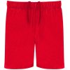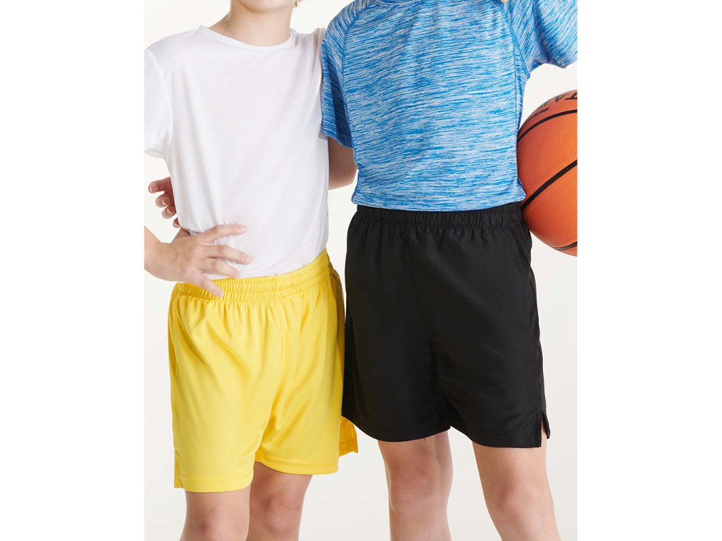 Dětské sportovní bermudy ze dvou materiálů. Elastický pas se stahovací vnitřní šňůrkou ve stejné barvě. Postranní pruh a vnitřní strana nohavice z prodyšné látky. Dvě postranní kapsy. Boční rozparky - přední strana je trochu delší než zadní. Odnímatelný štítek. Dostupné i v dospělých velikostech.