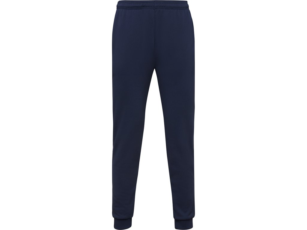 Sportovní kalhoty s elastickým pasem a nastavitelnou šňůrkou. Boční kapsy se zapínáním na zip. Kontrastní pruhy v bílé barvě. Lem s 1x1 žebrovanou manžetou. Lze kombinovat s bundou LEROS.