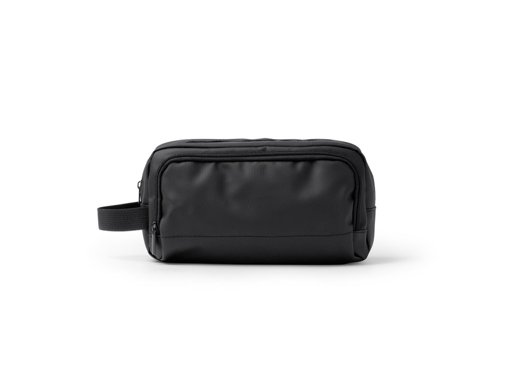 Toaletní taška z PU kůže s dvojitou přihrádkou a zapínáním na zip, ideální pro bezpečné a stylové uspořádání toaletních potřeb. Součástí je držadlo na přenášení.