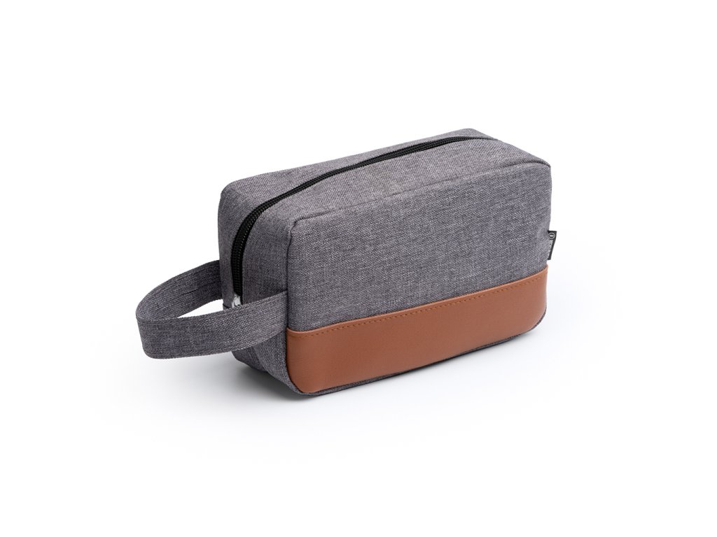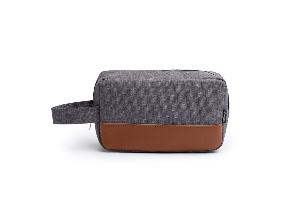 Toaletní taška z recyklovaného polyesteru RPET s detaily z PU kůže, ideální pro značení. Obsahuje rukojeť pro přenášení, která kombinuje udržitelnost a styl. Přenášejte své věci pohodlně a elegantně.