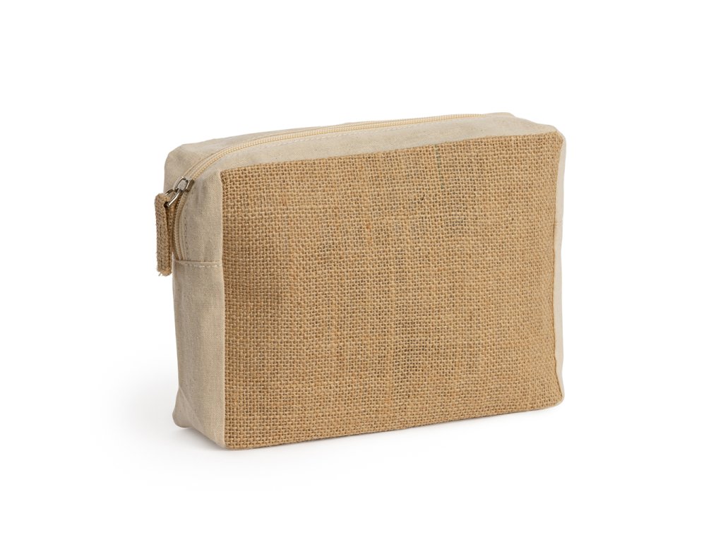 Toaletní taška z bavlny a laminované juty. Zip s odpovídajícím jutovým taháčkem.