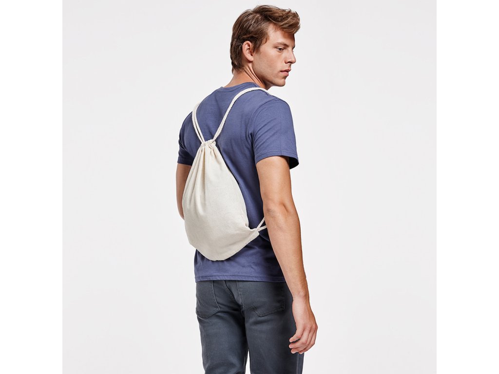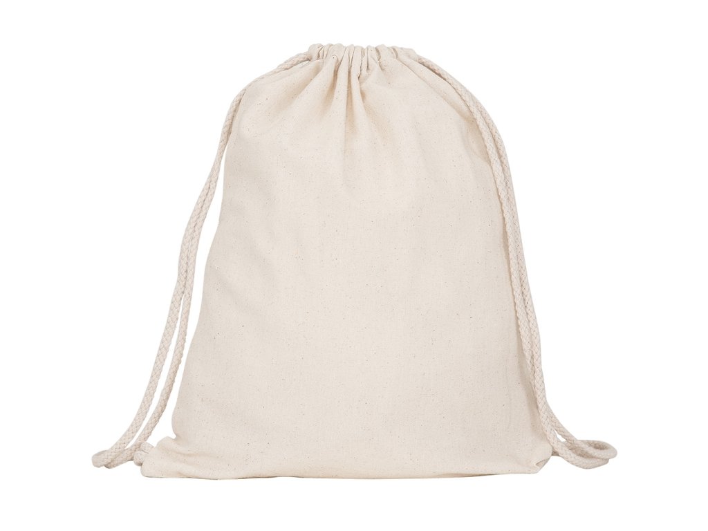 Bavlněný multifunkční batoh. Nastavitelné šňůrky ve stejné barvě batohu na zádové části, které mají tloušťku 8 mm. Odnímatelný štítek.