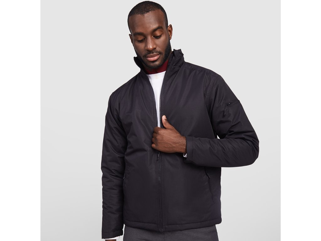 Pánská prošívaná a nepromokavá bunda z velmi odolného materiálu. Vysoký límec s vnitřní stranou v žebrovém úpletu 2x2.Bunda má přední zip ve stejném odstínu s ochranou brady, dvě přední kapsy s dvojitou funkcí-jedna otevřená kapsa a jedna na zip.-Bunda má zároveň kapsu se zipem a tapetou na levém rukávě a vnitřní kapsu se zipem na levé straně.Spodní patent je nastavitelný pomocí stahovací tkaničky. Bunda je vodě i větru odolná a má vnitřní zip pro snadný přístup pro tisk nebo výšivku.