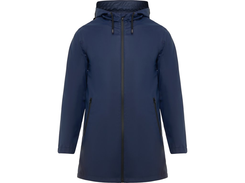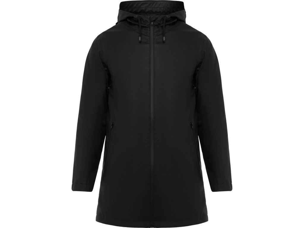 Nepromokavá bunda s kontrastními detaily v černé bervě a rozparkem na zadním lemu. Bunda má kapuci s kšiltem a dvě boční kapsy na zip.