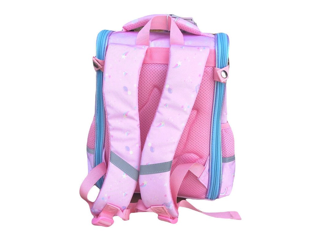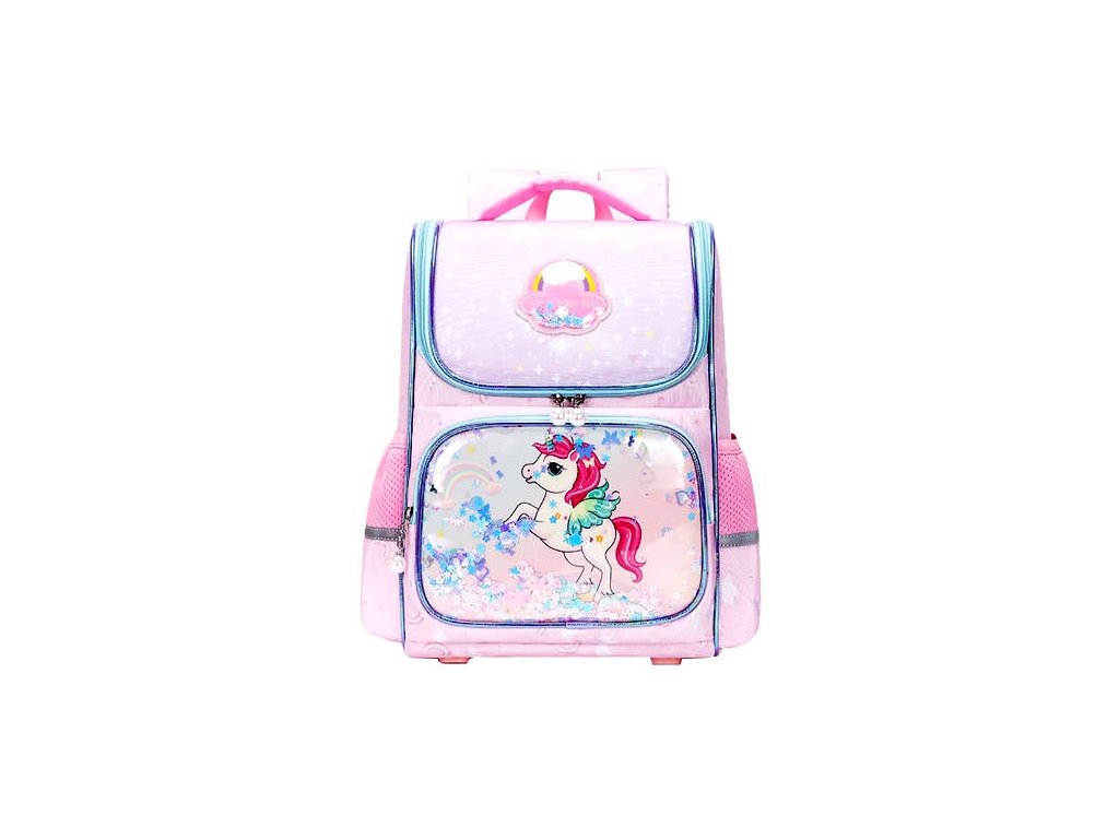 Školní dětská aktovka s motivem Jednorožce. Vhodná pro první stupeň Základní školy. Funkční pohodlná aktovka disponuje velkou vnitřní kapsou na zip, jejíž součástí je organizér, takže se sešity a knihy skvěle vejdou. Z vnější strany je menší kapsa a po bocích dvě kapsy na láhev s pitím. Díky ergonomicky tvarovaným zádům a polstrovaných nastavitelných ramenních popruhů je nošení aktovky velmi pohodlné. Lehká konstrukce drží tvar. Aktovka je vyrobená s odolného materiálu, je voděodolná. Ze spodu má silikonové nožky, které chrání proti nečistotám. Na aktovce jsou všité reflexní prvky pro větší bezpečnost. Dále obsahuje perly na zámcích kapes, obrázek jednorožce je v průhledné kapse s konfetami.