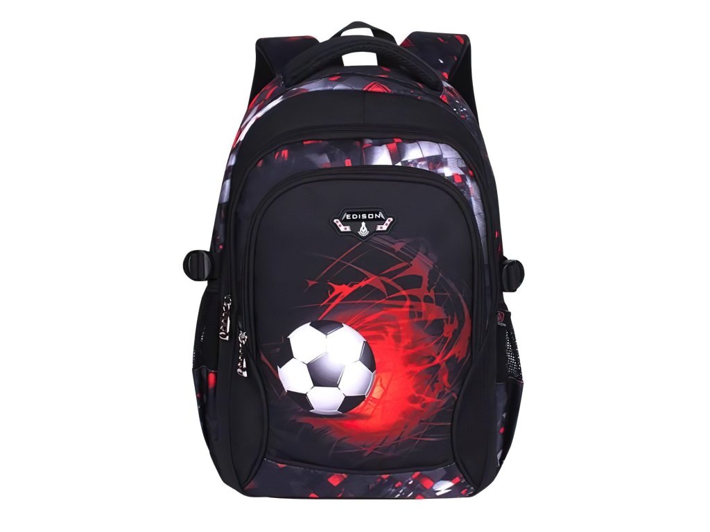 Školní dětský batoh v moderním černém provedení s dynamickým potiskem fotbalového motivu.